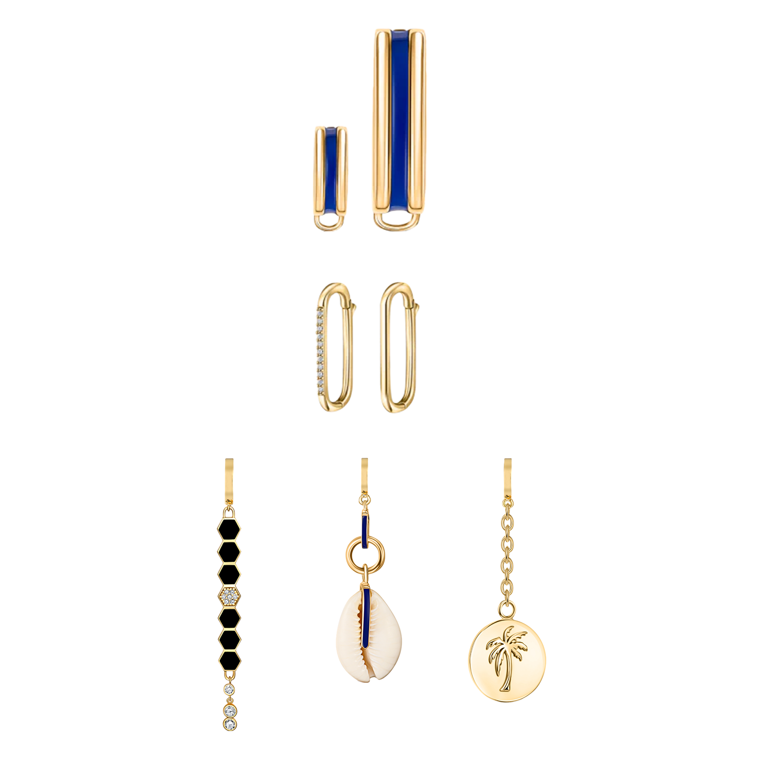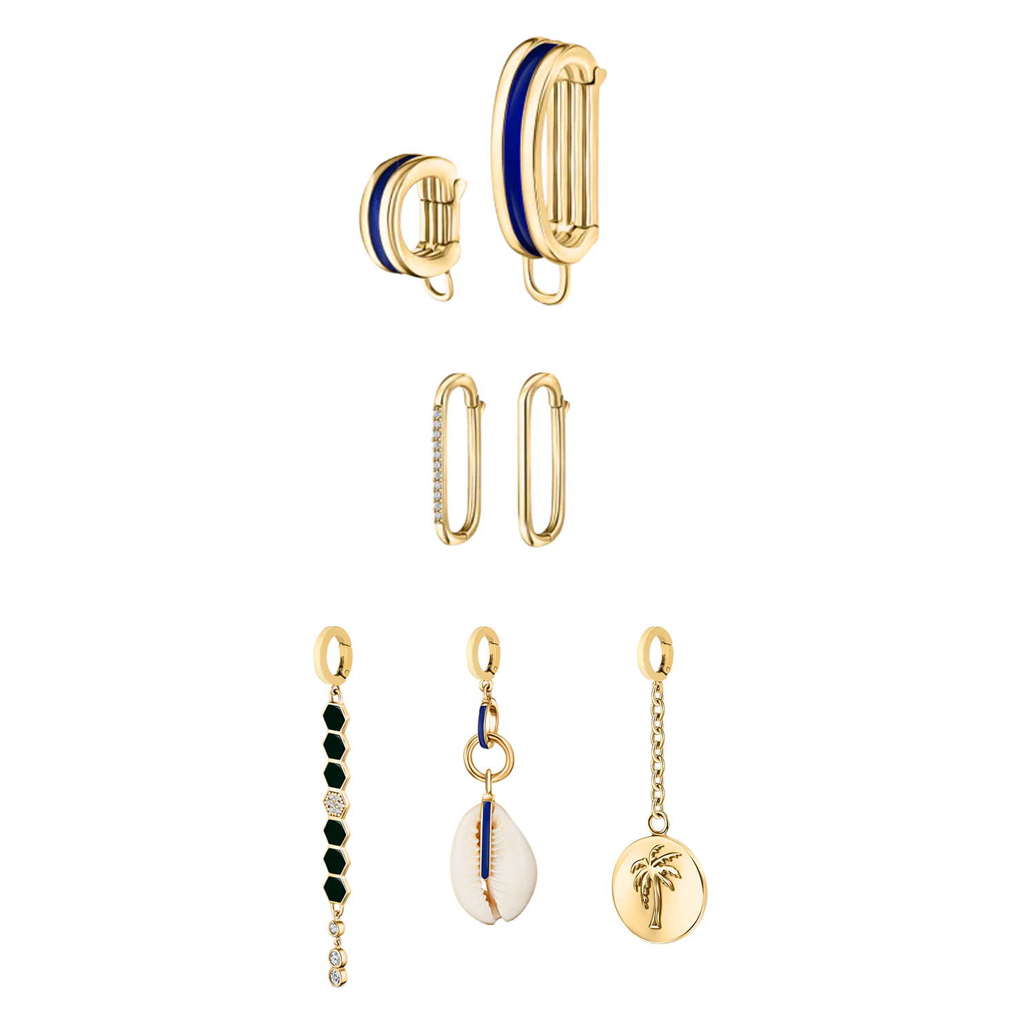 - 18K Yellow Gold PVD-Coated on Stainless Steel with Cubic Zirconia Pavé, Natural Cowrie Shell, and Blue and Black Enamel detailing.